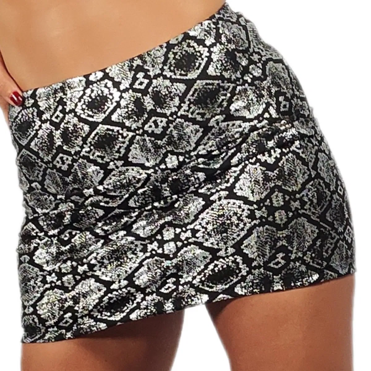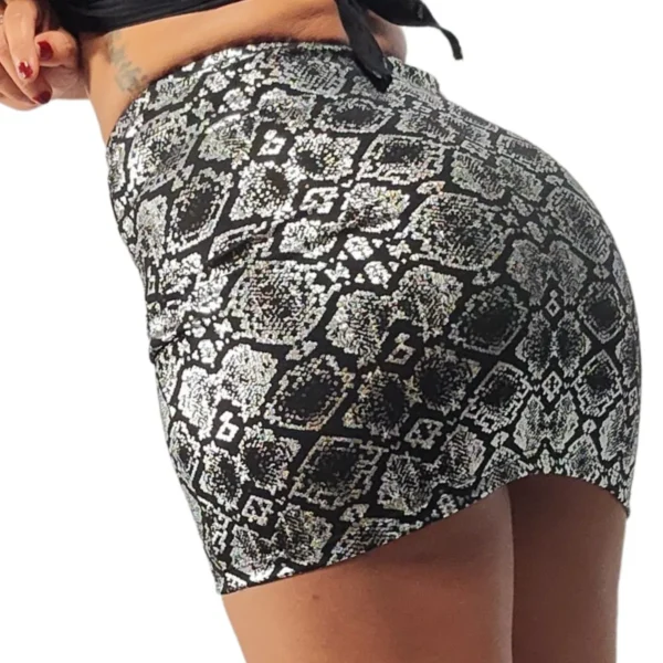 Hermosa Minifalda confeccionada en microfibra con algodon elastizada, estampado Reptil Plateado, modelo tubo o pencil, la podes llevar tiro alto o bajo, eso lo regulas vos, es un modelo comodo , te viste y se transforma en una prenda bijoux en tu guardarropas, si tenes un evento y queres estar chic esta es la prenda, te levantara cualquier outfit!.